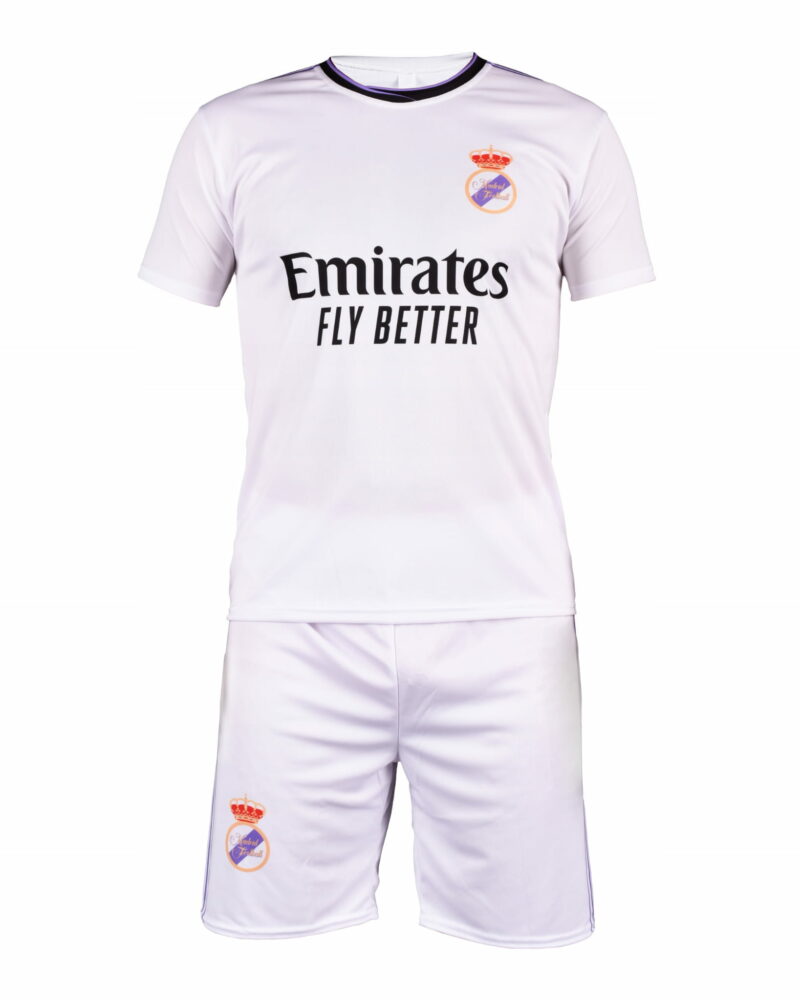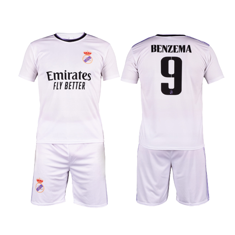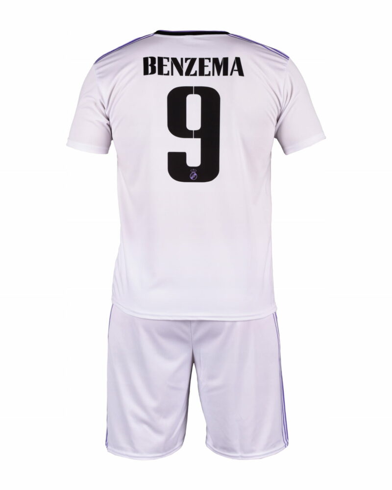 Detský dres na štýl Realu Madrid Benzema 2022/23 replika určený pre malých fanúšikov Realu a Benzemu. Štandardný strih. Sada obsahuje tričko a šortky. Na zadnej strane charakteristické číslo 9 a meno Benzema. Klubová biela farba.