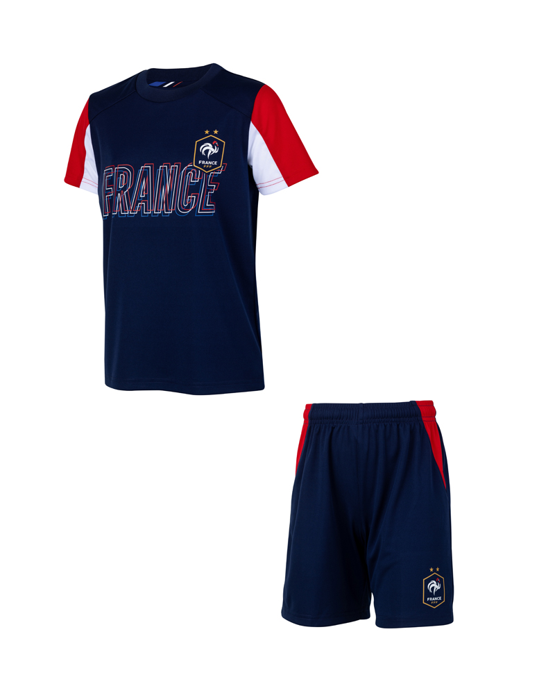 Detský futbalový set Francúzsko pre všetkých fanúšikov Les Bleus obsahuje dres a trenírky. Vpredu znak Francúzska a nápis France. Modro-červená farba. 100% polyester. Možnosť potlače vlastného mena a čísla. Oficiálny licencovaný produkt Francúzskej futbalovej federácie.