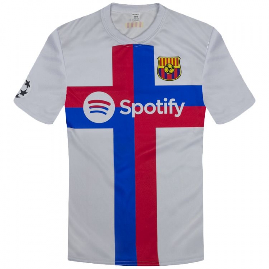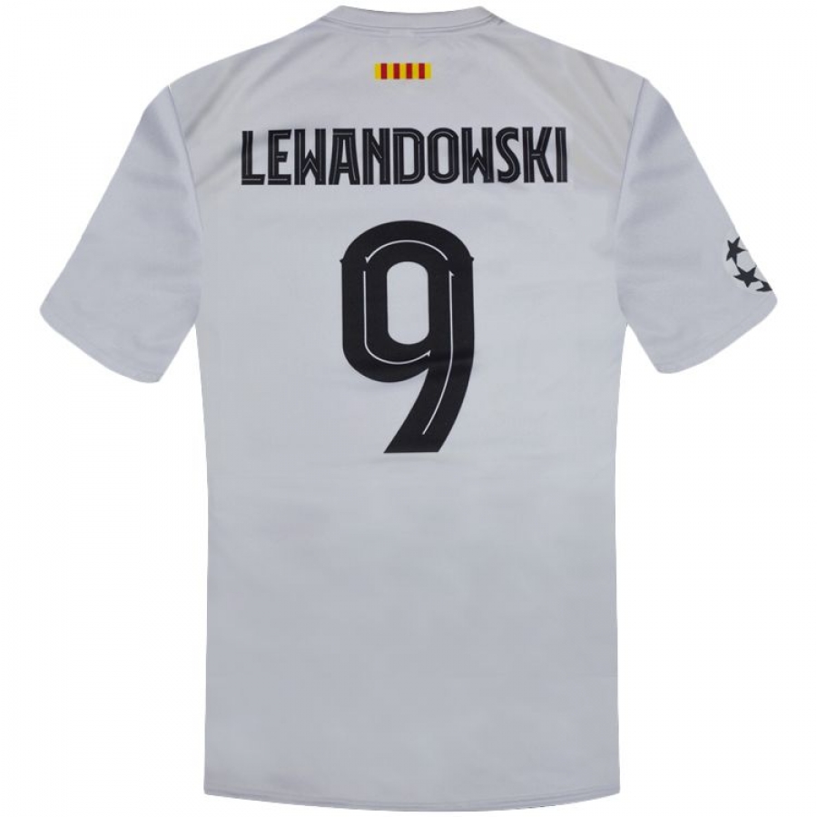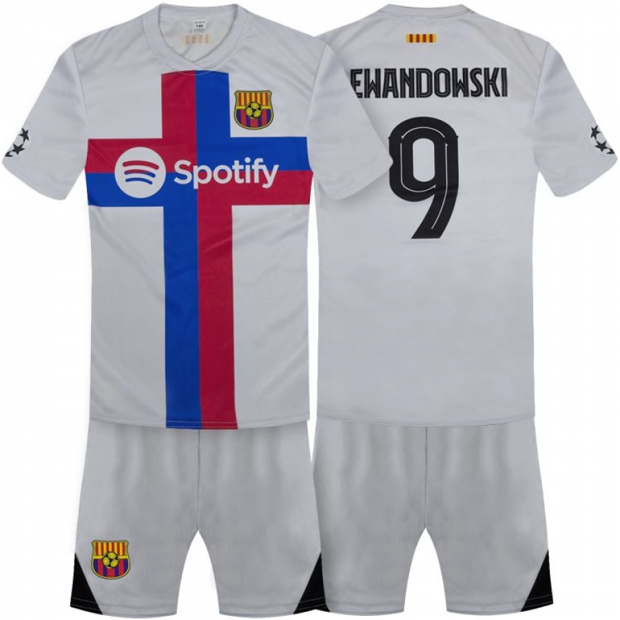 Detský dres na štýl FC Barcelony Lewandowski 2022/23 replika bielej farby určený pre malých fanúšikov Barcelony a Lewandowskeho. Štandardný strih. Sada obsahuje tričko a šortky. Na zadnej strane charakteristické číslo 9 a meno Lewandowski. Klubová biela farba.