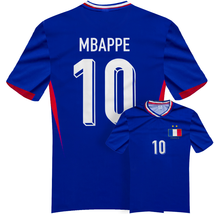 Detský dres na štýl francúzskej reprezentácie s menom Mbappe 2024 replika určený pre malých fanúšikov Mbappeho. Štandardný strih. Sada obsahuje tričko a šortky. Na zadnej strane charakteristické číslo 10 a meno Mbappe. Tabuľku veľkostí nájdete v popise produktu nižšie.
