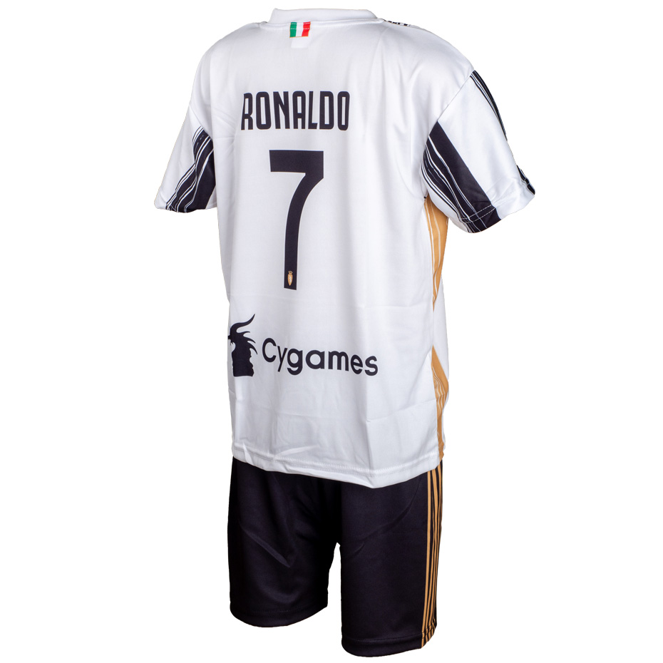 Detský dres Ronalda z Juventusu 2020/21 replika určený pre malých fanúšikov Ronalda. Štandardný strih. Sada obsahuje tričko a šortky. Na zadnej strane charakteristické číslo 7 a meno Ronaldo. Tabuľku veľkostí nájdete v popise produktu nižšie.