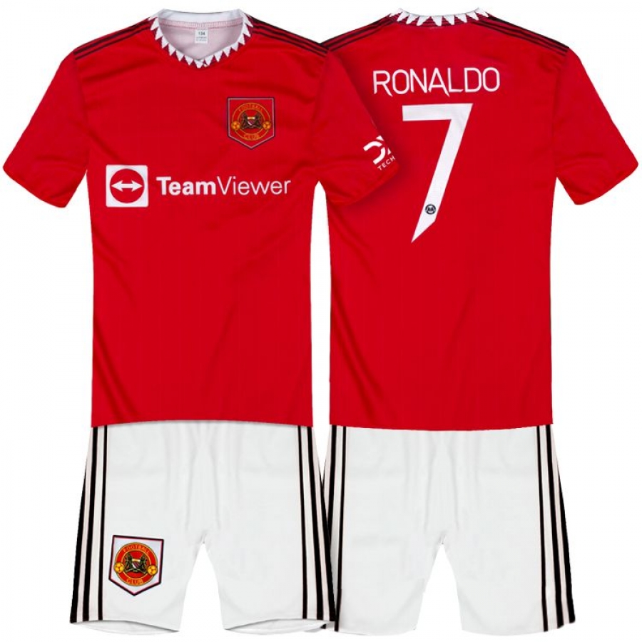 Detská sada dres a trenírky Ronaldo na štýl Manchestru United sezóny 2022/23. Replika určená pre malých fanúšikov CR7. Štandardný strih. Sada obsahuje tričko a šortky. Na zadnej strane charakteristické číslo 7 a meno Ronaldo. Tabuľku veľkostí nájdete v popise produktu nižšie.