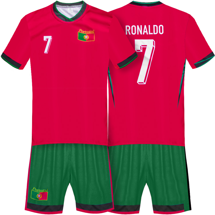Detská sada dres a trenírky Ronaldo na štýl Portugalska sezóny 24. Replika určená pre malých fanúšikov CR7. Štandardný strih. Sada obsahuje tričko a šortky. Na zadnej strane charakteristické číslo 7 a meno Ronaldo. Tabuľku veľkostí nájdete v popise produktu nižšie.