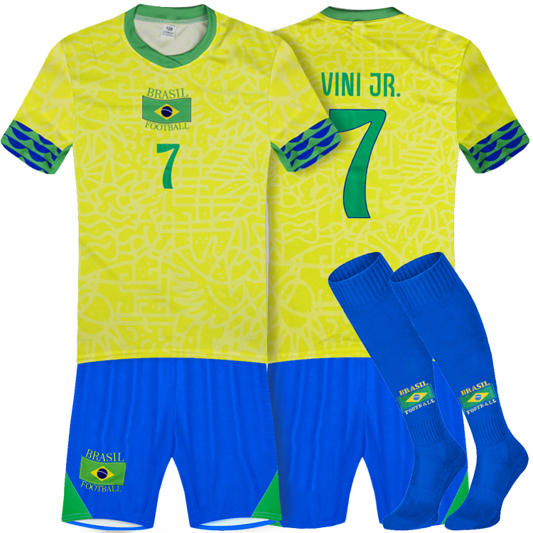 Detský dres na štýl Brazílie s menom Vini Jr replika určený pre malých fanúšikov Viniciusa Juniora. Štandardný strih. Sada obsahuje tričko a šortky. Na zadnej strane charakteristické číslo 7 a meno Vini Jr. Tabuľku veľkostí nájdete v popise produktu nižšie.
