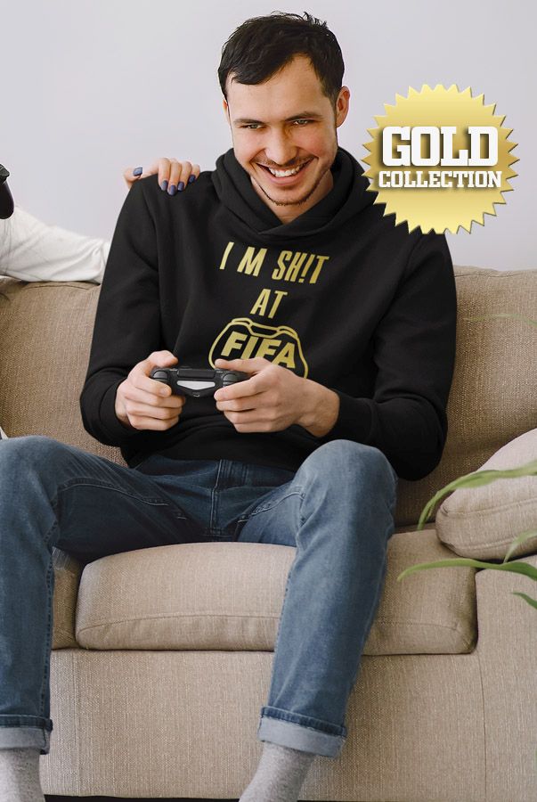 Futbalová mikina FIFA I am S**t pre všetkých, ktorí milujú tento nádherný šport a ktorí milujú drtiť FIFA 24/7. Teraz aj v špeciálnej a exkluzívnej ZLATEJ edícii. Rôzne veľkosti, čierna farba. Kolekcia [PITČ].
