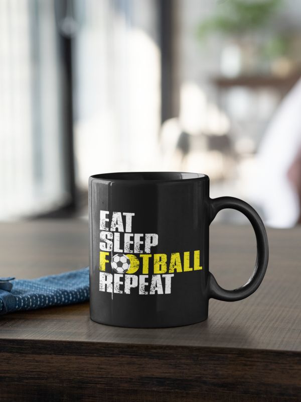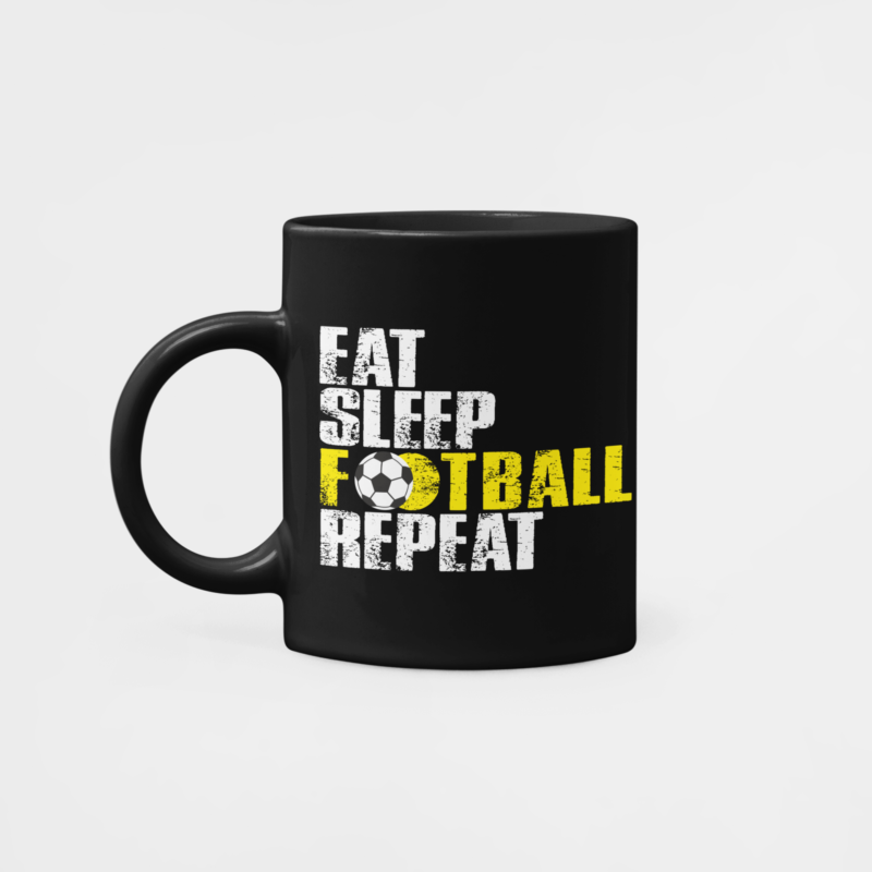 Hrnček s nápisom Eat Sleep Football Repeat pre všetkých, ktorí by najradšej iba spali a hrali futbal. V čiernej farbe s bielou a žltou grafikou.