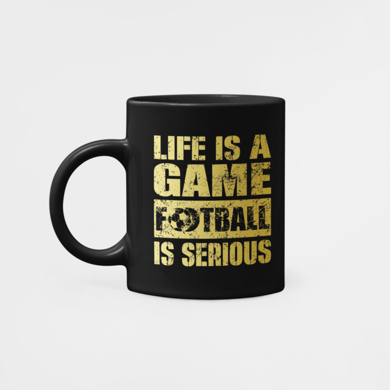 Hrnček s nápisom Life Is a Game, Football Is Serious pre všetkých, ktorí milujú tento nádherný šport a je pre nich dôležitý. Čierna farba, zlatá grafika. Objem 300 ml.