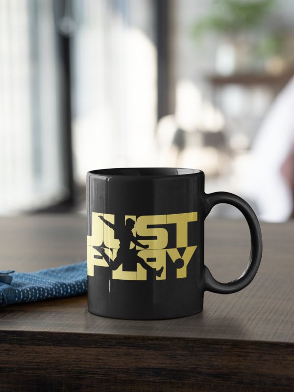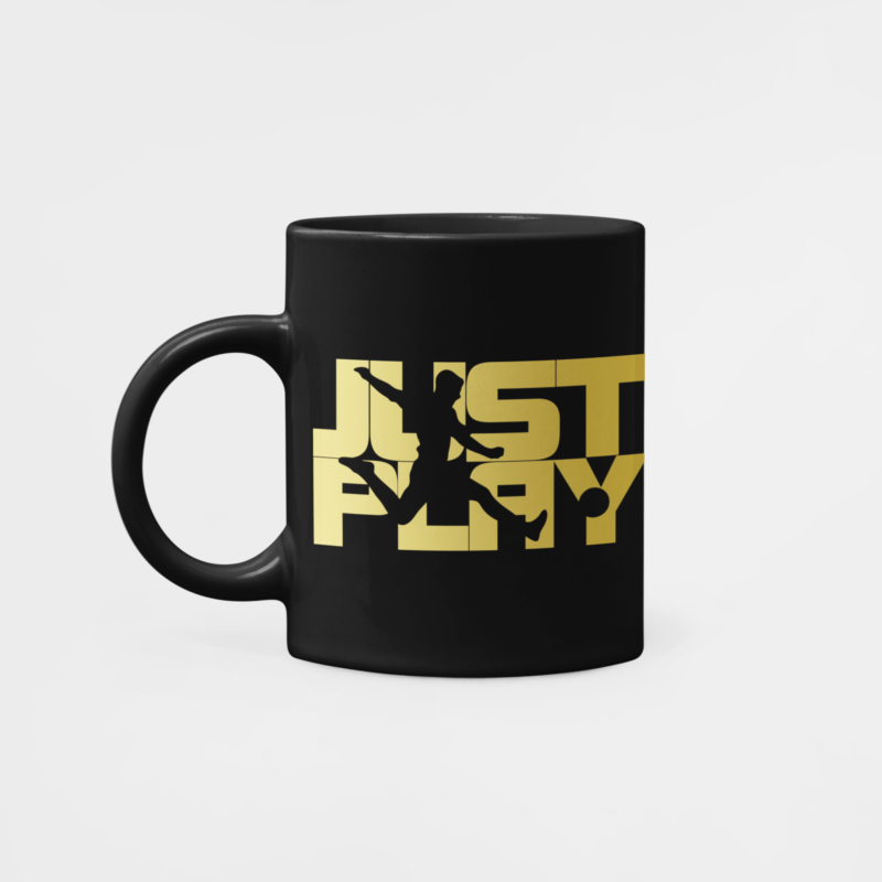Hrnček s nápisom Just Play pre všetkých futbalistov, ktorí milujú byť na ihrisku alebo si len tak zakopať. V čiernej farbe so zlatou grafikou.