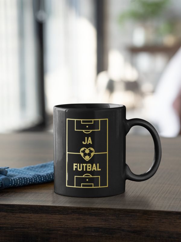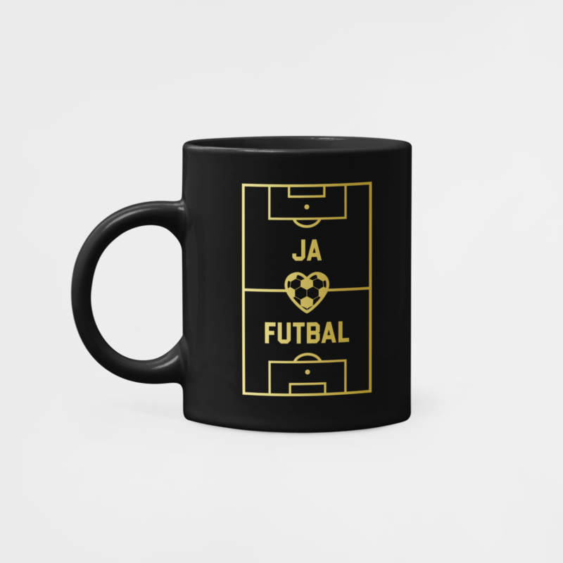 Hrnček s nápisom Milujem futbal a obrázkom ihriska pre všetkých, ktorí milujú tento nádherný šport a je pre nich dôležitý. Čierna farba, zlatá grafika. Objem 300 ml.