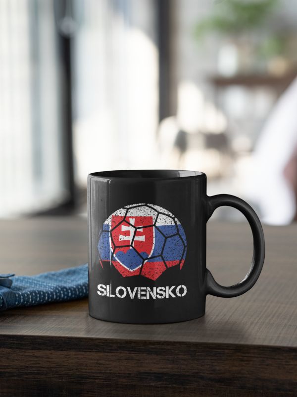 Futbalový hrnček so slovenským motívom – futbalová lopta v tvare slovenskej zástavy. Pre všetkých fanúšikov slovenskej repre. V čiernej farbe. Slovensko do toho!