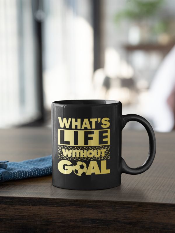 Hrnček s nápisom What is Life Without Goal pre všetkých strelcov alebo pre všetkých, ktorí majú v živote radi motiváciu a ciele. V čiernej farbe so zlatou grafikou.