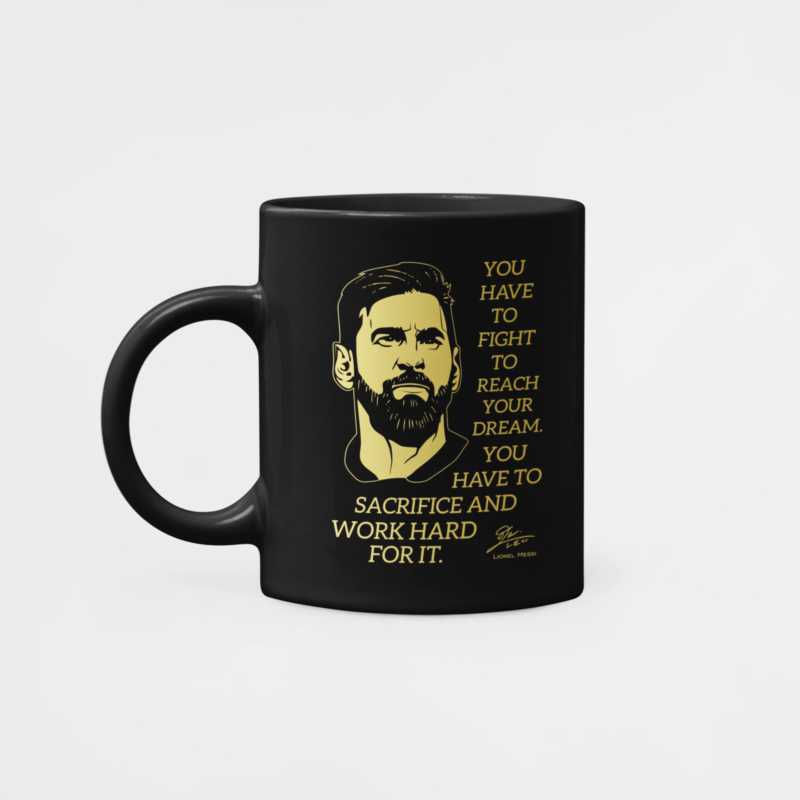 Jedinečný hrnček s motívom Messiho a jeho výrokom Musíte bojovať, aby ste dosiahli svoj sen. Musíte sa pre to obetovať a tvrdo pracovať. Pre všetkých fanúšikov argentínskej a barcelonskej #10. Messi je proste najlepší. V čiernej farbe so zlatou grafikou.