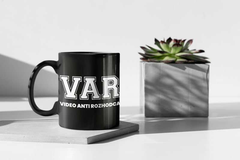 Hrnček s nápisom VAR pripomínajúci, že od sezóny 2019/2020 tu máme nového rozhodcu. Futbalu pomáha alebo nepomáha? Záleží, či je tento (anti) rozhodca proti vášmu tímu alebo nie. Môžete rozobrať pri kávičke alebo čaji.