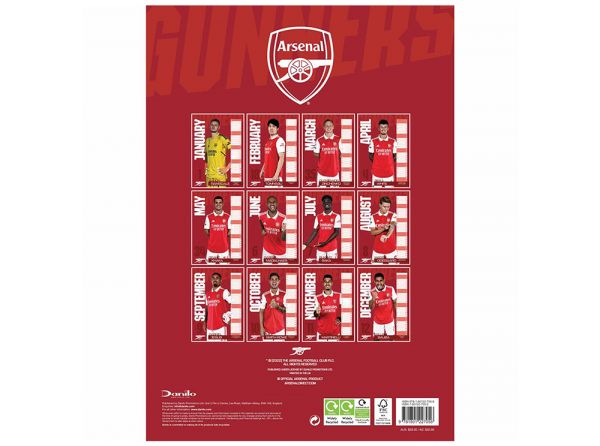 Kalendár Arsenalu na rok 2023 pre všetkých fanúšikov The Gunners. Jedna titulná fotka a 12 ďalších. Fotky hráčov v drese, meno a klubový znak. Formát A3 (297 x 420 mm), väzba krúžková. Oficiálny produkt Arsenal FC.