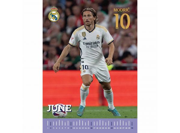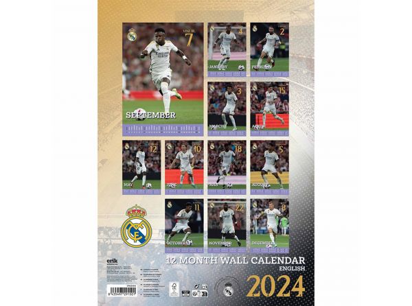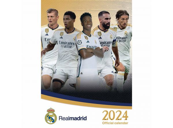 Kalendár Real Madrid na rok 2024 pre všetkých fanúšikov madridského veľkoklubu. Jedna titulná fotka a 12 ďalších. Fotky hráčov v drese, meno a klubový znak. Formát A3 (297 x 420 mm), väzba krúžková. Oficiálny produkt Realu Madrid.