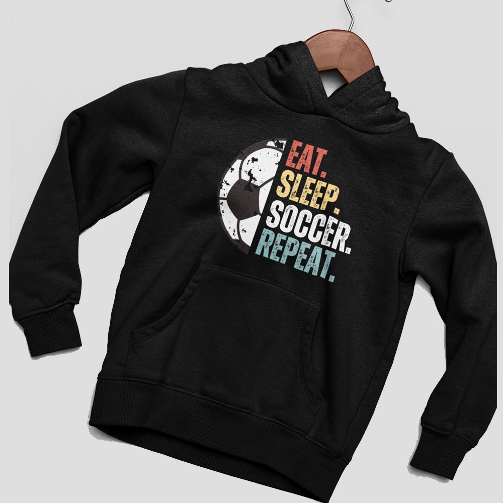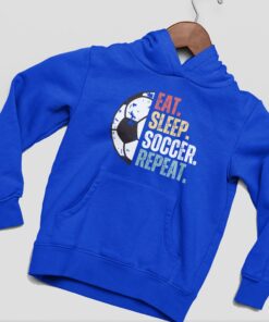 Mikina Eat-Sleep-Soccer-Repeat na voľný čas pre všetkých fanúšikov futbalu. Dostupné sú modré a čierne mikiny. 100% bavlna. V ponuke sú detské a pánske veľkosti.