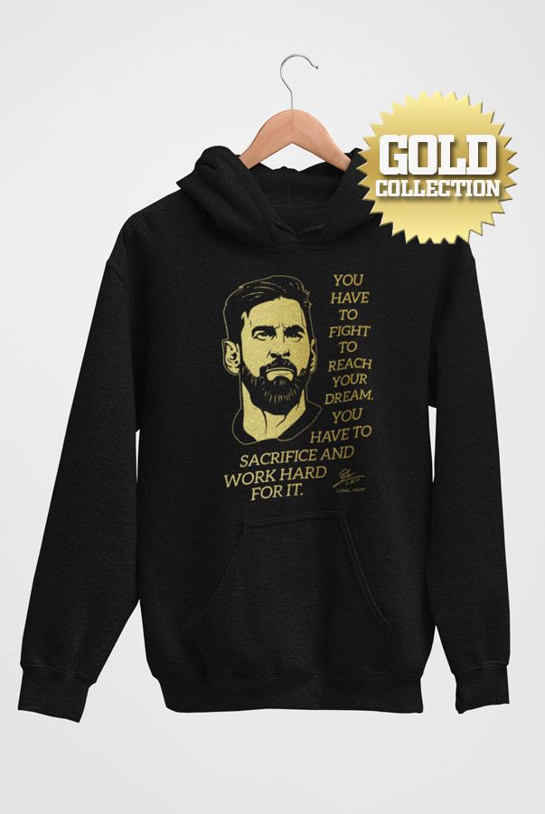 Mikina Messi s mottom Musíte bojovať, aby ste dosiahli svoj sen. Musíte sa pre to obetovať a tvrdo pracovať. Messi je proste najlepší. Teraz aj v špeciálnej a exkluzívnej ZLATEJ edícii. Rôzne veľkosti, čierna farba. Kolekcia [PITČ].