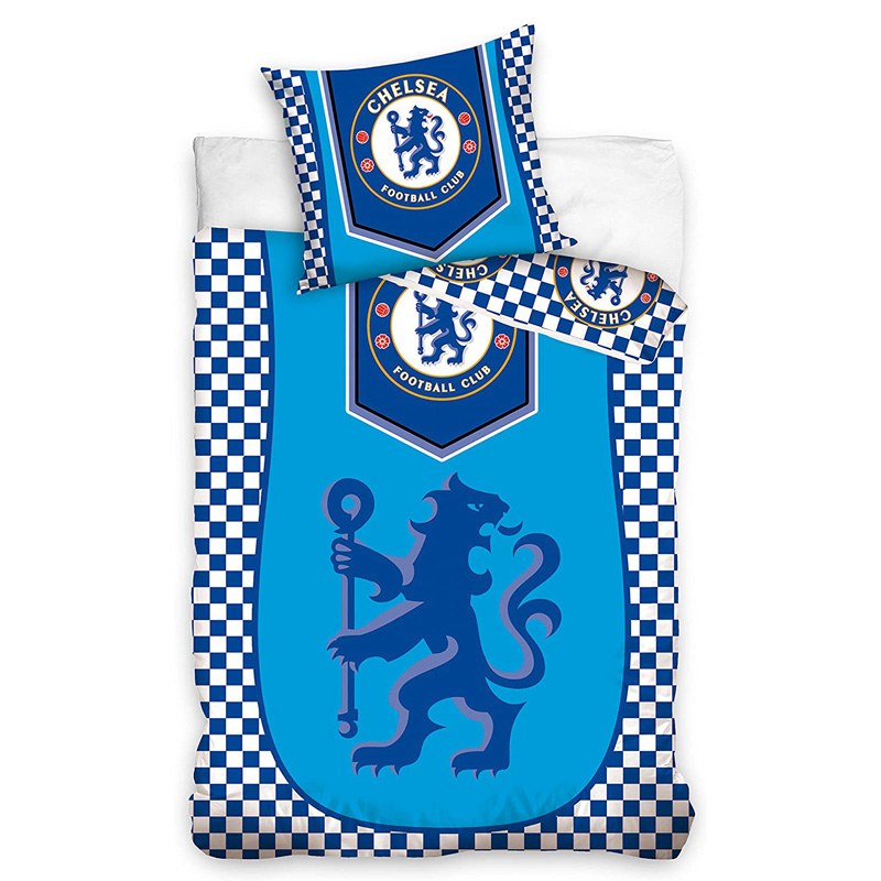 Obojstranné bavlnené obliečky FC Chelsea na posteľ a vankúš. Perina je vo veľkosti 140cm x 200cm. Obliečka na vankúš vo veľkosti 70x80cm. Modro-biela farba so znakom Chelsea. 100% bavlna. Originálny produkt licencie Chelsea FC.