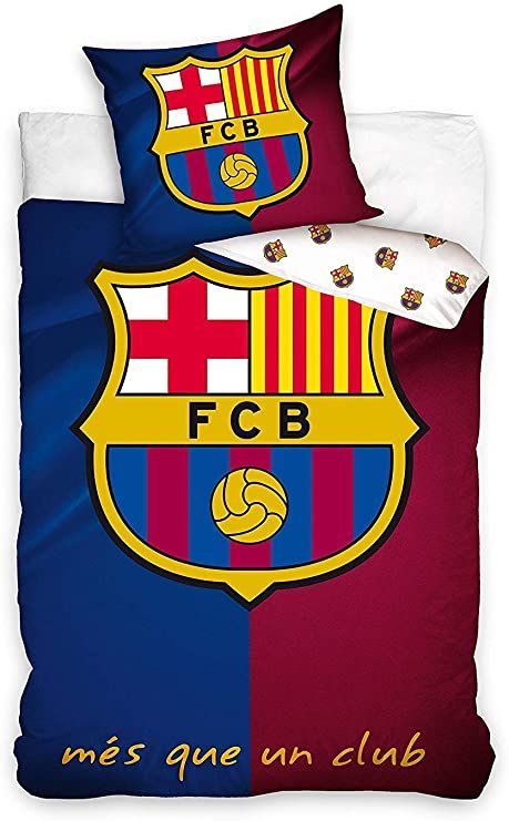 Bavlnené obliečky FC Barcelona na posteľ a vankúš. Perina je vo veľkosti 140cm x 200cm. Obliečka na vankúš vo veľkosti 50x70cm. Na vrchnej strane periny je veľké logo FC Barcelony s nápisom “més que en club” – viac ako klub. Rubová strana je bielej farby s malými logami katalánskeho klubu.  Materiál: 100% bavlna. Originálny produkt licencie FC Barcelona.