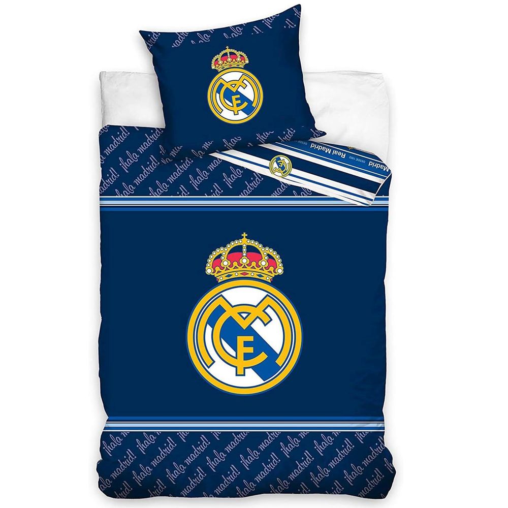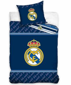 Obliečky Real Madrid modré s motívom španielskeho veľkoklubu. Perina: 140cm x 200cm modrá s veľkým znakom klubu a nápismi “hala madrdid” na prednej strane. Zadná strana modré pásiky s logami klubu a nápismi Real Madrid” Obliečka na vankúš: 60x63cm modrá s veľkým znakom klubu a nápismi “hala madrdid”. 100% bavlna. Oficiálny produkt licencie Real Madrid.