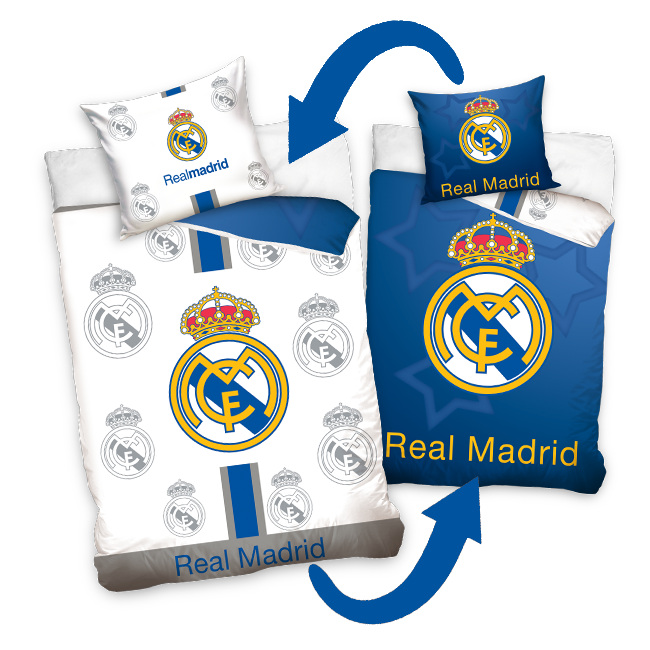 Obliečky Real Madrid s motívom španielskeho veľkoklubu. Perina 140cm x 200cm, vankúš 70x90cm s veľkým logom klubu a nápisom REAL MADRID. Obojstranné – biela alebo modrá farba. 100% bavlna. Oficiálny produkt licencie Real Madrid.