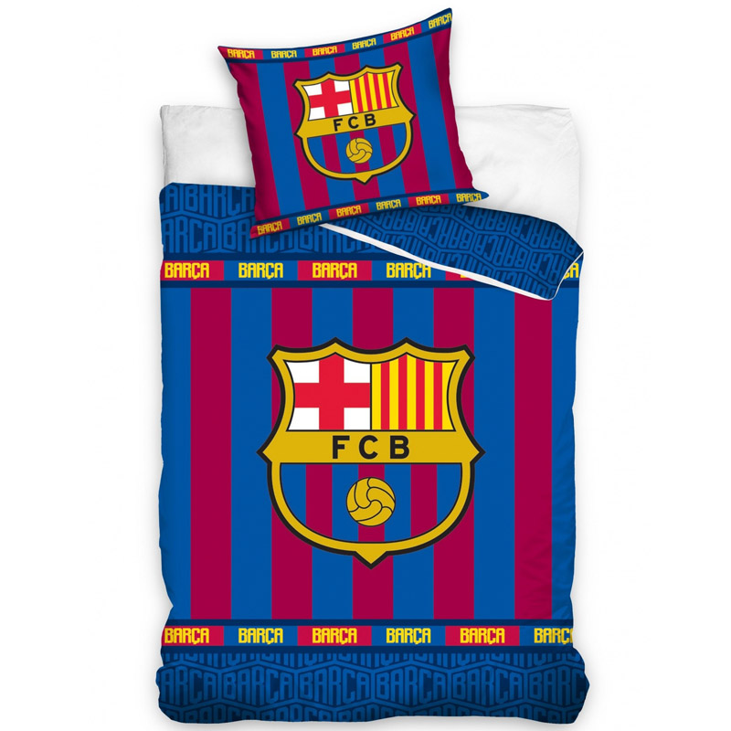 Obojstranné bavlnené obliečky FC Barcelona na posteľ a vankúš. Perina je vo veľkosti 140cm x 200cm. Obliečka na vankúš vo veľkosti 50x75cm. Klubové farby, veľké logo FC Barcelona.  Materiál: 100% bavlna. Originálny produkt licencie FC Barcelona.