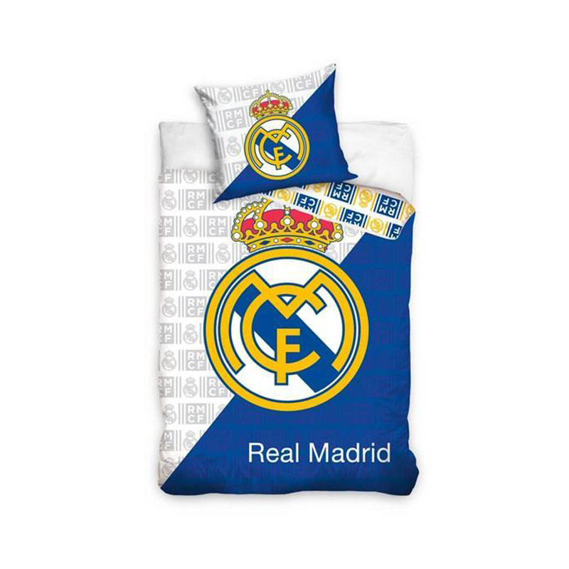 Obliečky Real Madrid s motívom španielskeho veľkoklubu. Perina 140cm x 200cm, vankúš 50x70cm s veľkým logom klubu a nápisom REAL MADRID. Obojstranné – biela a modrá farba. 100% bavlna. Oficiálny produkt licencie Real Madrid.