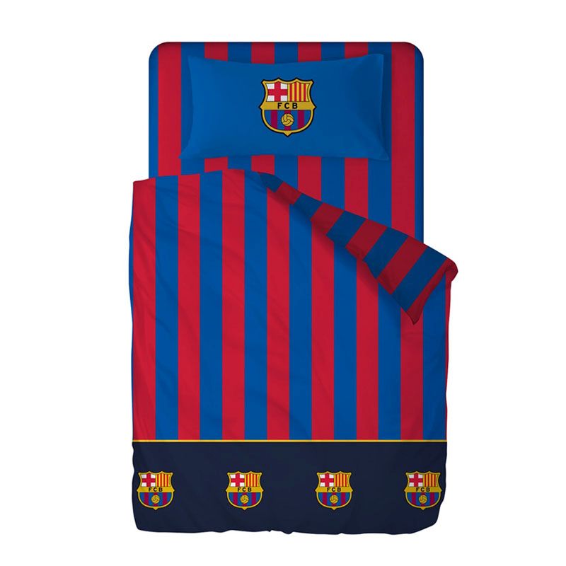 Posteľné obliečky s plachtou Barcelona bordovo-modré. Perina je vo veľkosti 135cm x 200cm + 28cm. Obliečka na vankúš je v atypickej veľkosti 45cm x 155cm. Plachta na posteľ je vo veľkosti 210cm x 270cm. Trojdielna súprava je bordovo-modrá s čiernym pásom na spodnej časti periny a logami FC Barcelona. Plachta je bordovo-modrej farby. Vankúš je modrej farby s logom klubu. Materiál: 52% bavlna, 48% polyester. Originálny produkt licencie FC Barcelona.