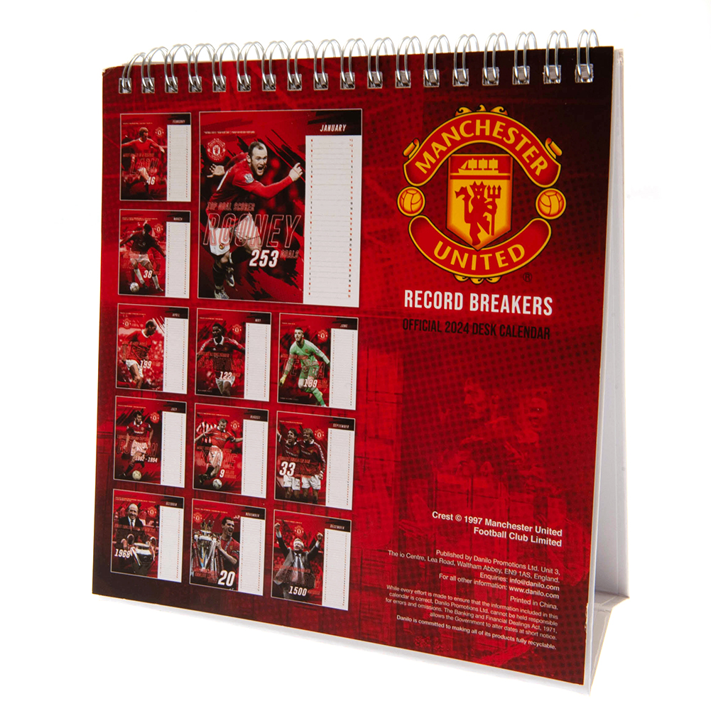 Stolový kalendár Manchester United na rok 2024 pre všetkých fanúšikov The Red Devils. Jedna titulná fotka a 12 ďalších – klubové rekordy hráčov. Formát 17cm x 16 cm. Oficiálny produkt Manchestru United.