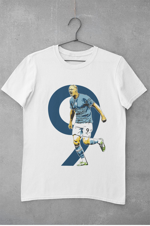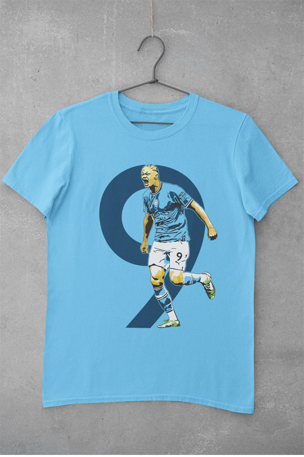 Tričko Haaland 9 s motívom ostrostrelca z Manchestru City pre všetkých fanúšikov Nóra a Citizens. 100% bavlna. V bledomodrej a bielej farbe. Pánske a chlapčenské veľkosti. Kolekcia [PITČ].