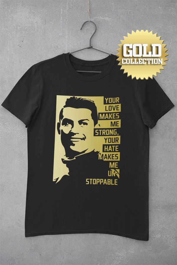 Tričko Ronaldo s mottom Vaša láska ma robí silnou, vaša nenávisť ma robí nezastaviteľnou. Pre všetkých fanúšikov CR7. Teraz aj v špeciálnej a exkluzívnej ZLATEJ edícii. 100% bavlna. Rôzne veľkosti, čierna farba. Kolekcia [PITČ].