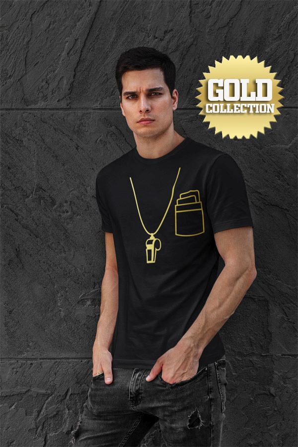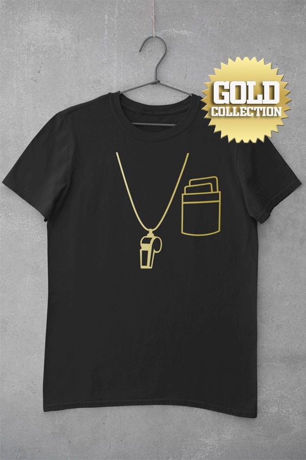 Futbalové tričko Rozhodca pre všetkých rozhodcov v špeciálnej a exkluzívnej ZLATEJ edícii. Píšťalka okolo krku a karty vo vrecku označujú jednoznačného pána na ihrisku. Pre všetkých futbalových nadšencov. 100% bavlna. Kolekcia [PITČ].