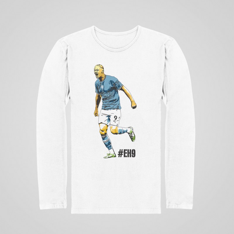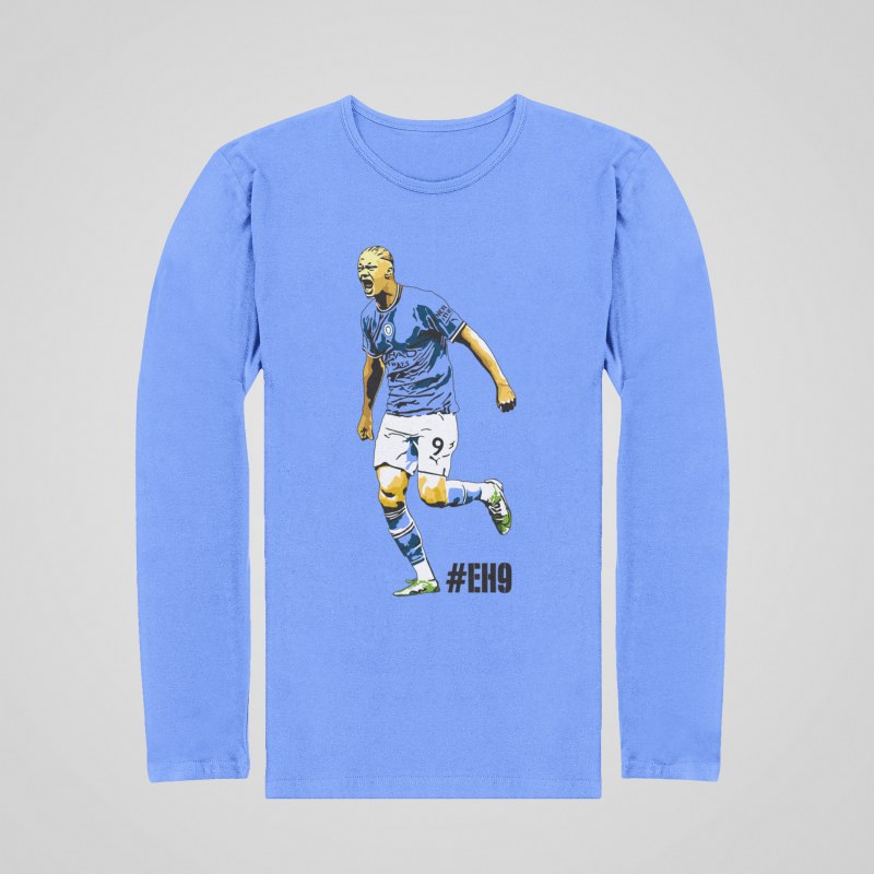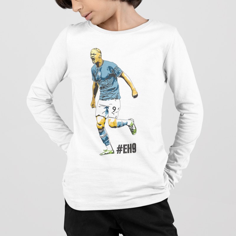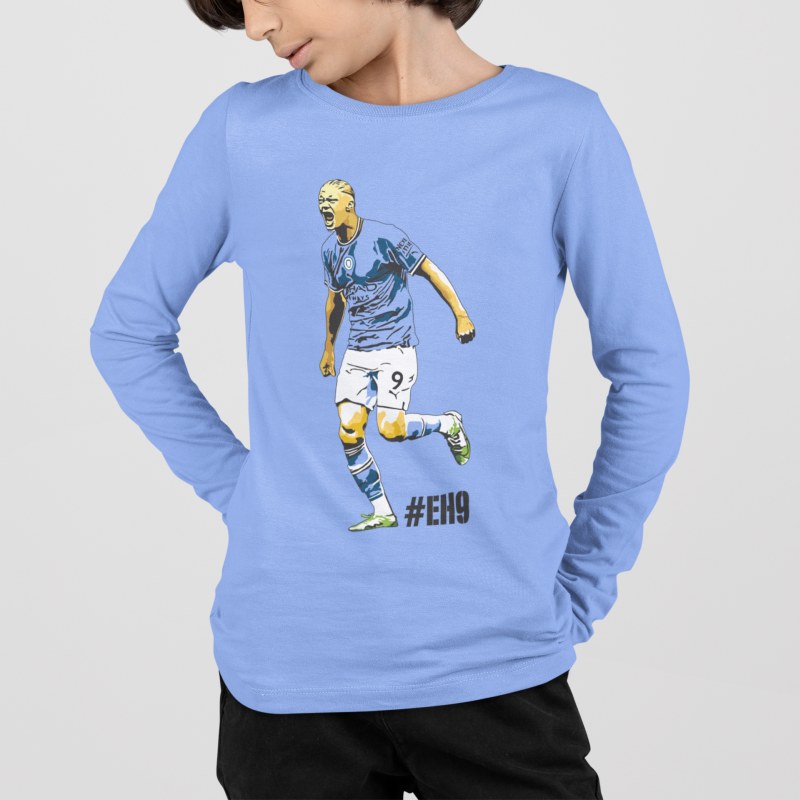 Tričko s dlhým rukávom Haaland s motívom ostrostrelca z Manchestru City pre všetkých fanúšikov Nóra a Citizens. 100% bavlna. V bledomodrej a bielej farbe. Pánske a chlapčenské veľkosti. Kolekcia [PITČ].