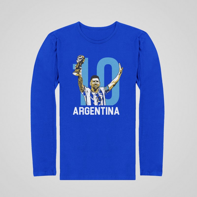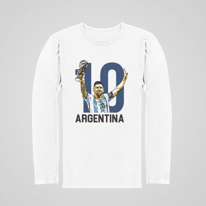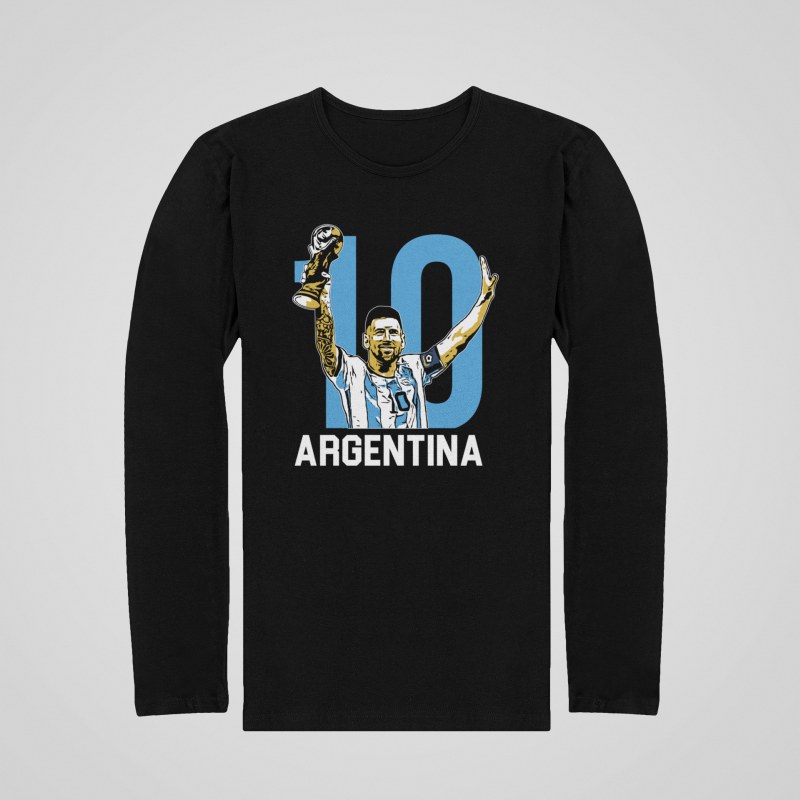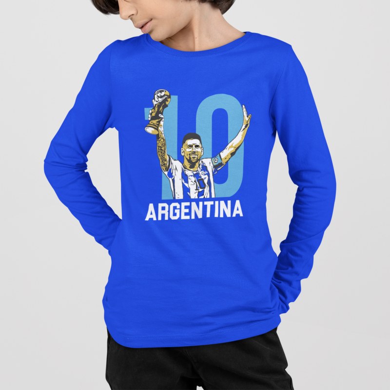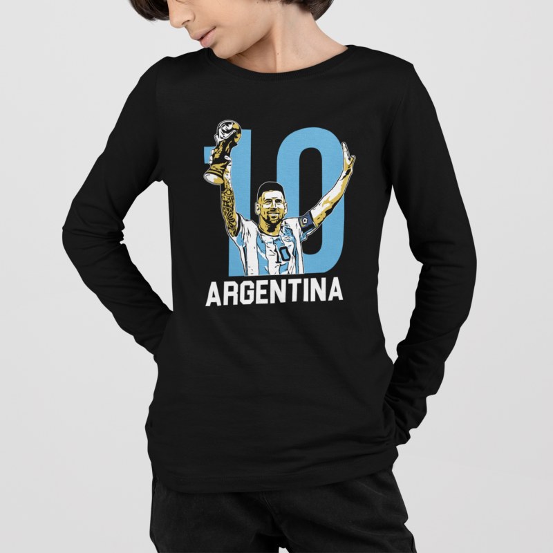 Tričko s dlhým rukávom Messi Argentína s motívom najväčšej legendy a kapitána majstrov sveta 2022. Pre všetkých fanúšikov futbalovej hviezdy. 100% bavlna. V modrej, čiernej a bielej farbe. Detské veľkosti. Kolekcia [PITČ].