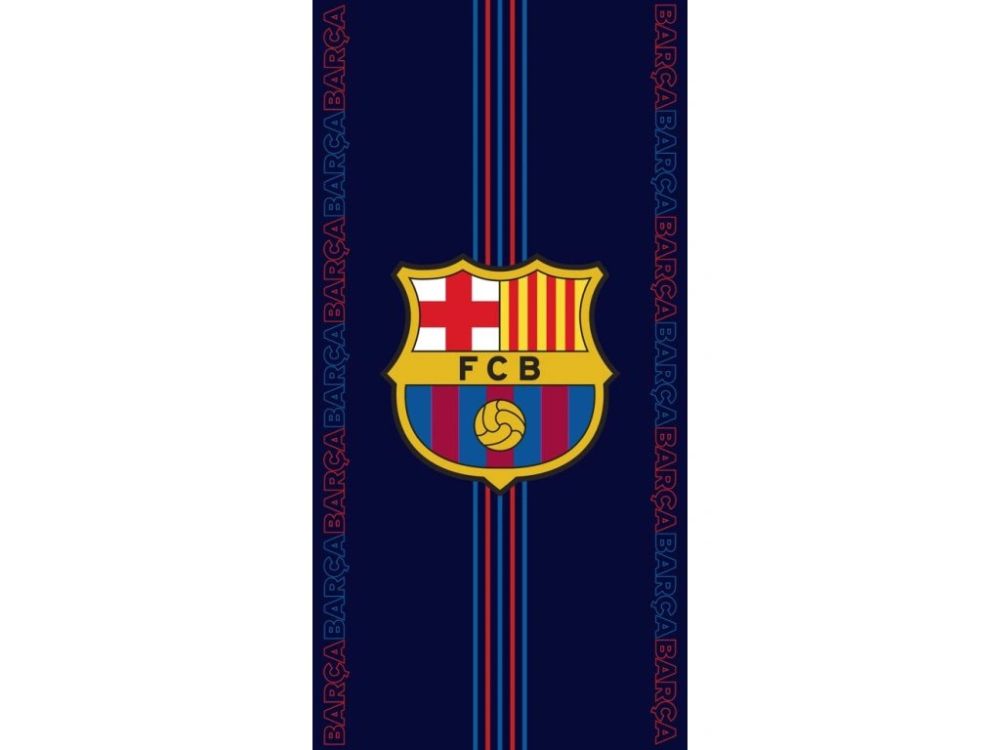 Uterák Barcelona tmavomodrý s logom klubu. Uterák je tmavomodrej farby so zvislými pruhmi v strede. Po bokoch osušky vedú zvisle nápisy BARCA v červenej a modrej farbe. Veľkosť 70cm x 140cm. Materál: 100% bavlna. Oficiálny produkt licencie FC Barcelona.